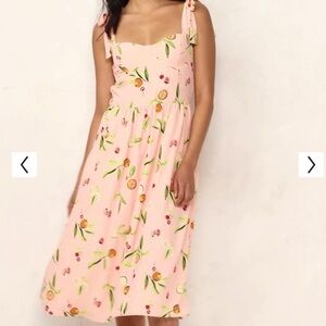 Charming pink dress with floral print. Features a sweetheart neckline and tie straps. Perfect for a casual outing. Novelty fruits print on a peachy pink linen blend midi dress with molded cups. Great preowned condition