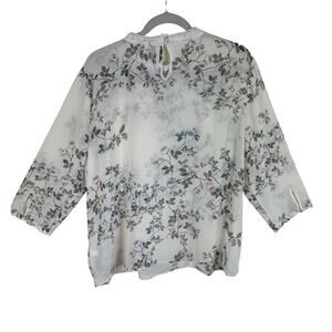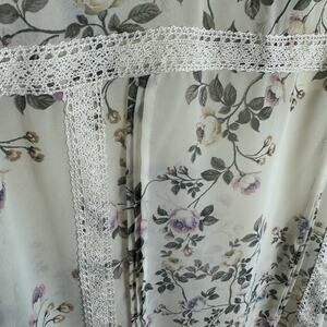 NWT. Floral sheer 3/4 sleeve lightweight pullover blouse with lace/crochet trim around neckline & down front. Has 2 buttons at back of neck (Top one is loose). Polyester material. Approx. measurements: Shoulder to hem 27", pit to pit 24", sleeve from neck to sleeve hem 23". Size XXL.