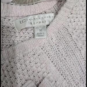 The LC Lauren Conrad sweater is a size M women's pullover in a light pink color. It features a crew neck with a tie neck detail adorned with a bow, crafted from a cotton blend and acrylic knit fabric. This designer sweater is perfect for adding a touch of elegance to your outfit.
