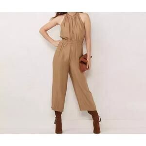 Pre-Owned LC Lauren Conrad Small Tan Zippered Halter Ruffle Neck Crop Jumpsuit.