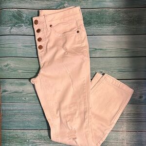 Chic high-rise jeans with gorgeous cooper button details. Perfect for versatile styling. Distressed and relaxed crop jeans. EUC