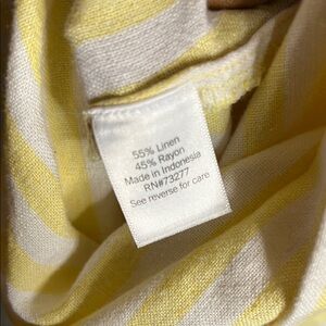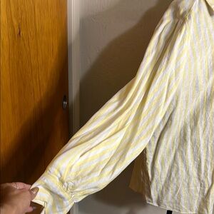 Chic yellow and white striped linen blend blouse, Button-up front. Long sleeves. Perfect for casual wear.
