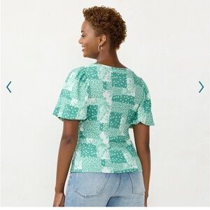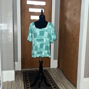 Brand new with tags from LC Lauren Conrad! This short bubble sleeve tee has an all over green patchwork print. Sweetheart neckline, pointelle details, polyester/rayon/spandex. Size xxl.