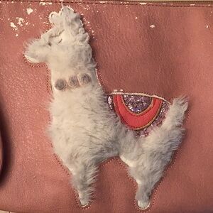 Rose pink. Does have peeling on the bag. Zipper. Llama on the front. Does have stains inside bag. Makeup bag.