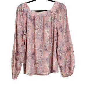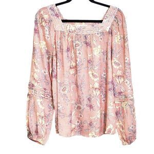 LC Lauren Conrad peach & white gingham floral print square neck long sleeve lightweight weight top in great condition 46" bust 25" long
