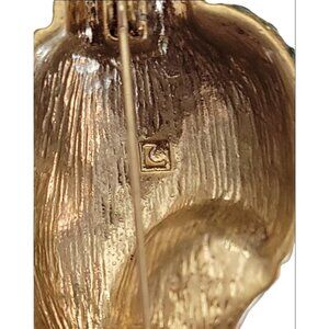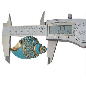 This brooch is a gorgeous piece that is sure to make a statement and add a touch of classic beauty to any outfit. Measures approximately 2.2 inches in length, this brooch features a delicate seashell design crafted from high-quality teal and robin's egg enamel. The enamel creates a smooth and glossy finish, reminiscent of the tranquil ocean waters. Sparkling rhinestones embellish the brooch, adding a hint of glamour to this piece. The back has LC marking with a secure clasp, ensuring it can be easily fastened to any garment or accessory.