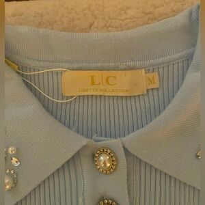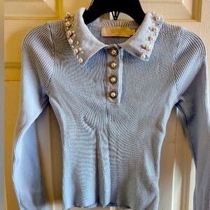 Stylish light blue ribbed top with pearl embellishments. Features a classic collar and button details. The perfect accent with your favorite jeans, or skirt.