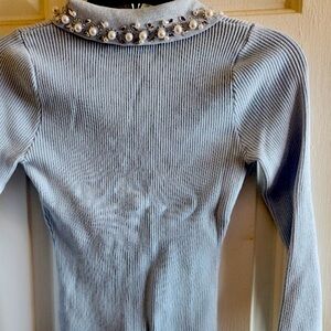 L+C (Medium) Pearl & Rhinestone Sequins Embellished Pastel Blue Ribbed Sweater