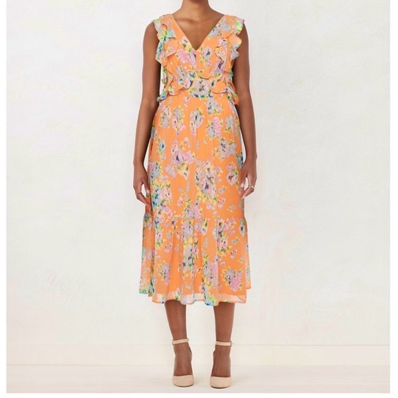 -Peach colored dress with light blue , lavender floral prints