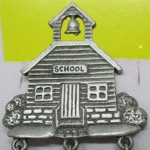 Never Worn Vintage Lindsay Claire Designs hallmarked LCD pewter dangle charm school house brooch tac pin back. Charm includes teacher's school bell, pencil, and apple.