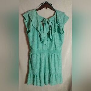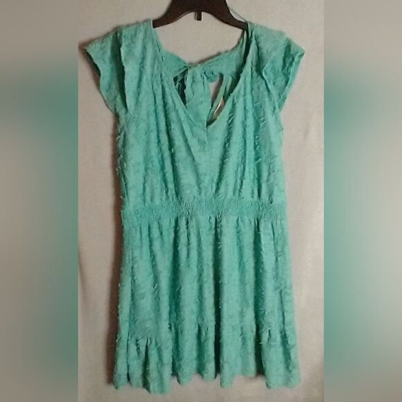 LC Dress in Aqua. Pull on/off. Has a tie in the back at the shoulder area. Size Large. Polyester and Spandex Blend for the shell and Polyester for the lining. The fabric has a shabby chic/shaggy type texture to it. Aqua color. Short skirt. V neck in front. No rips, tears or discolorations. Smoke free/Dog friendly home.