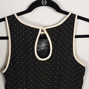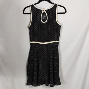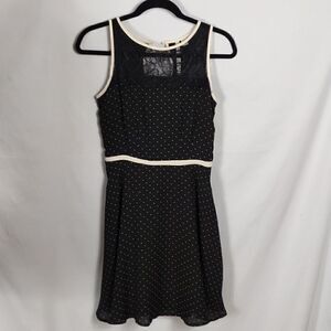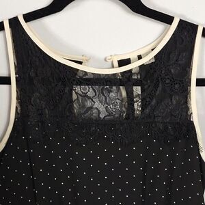 This black and white polka dot LC Lauren Conrad sleeveless mini dress is a size 2 with a pit to pit measuring 17" and a length of 34". It zips up the side and has a button closure in back. Sheer lace and cutouts. Fully lined. Shell: 100% polyester, Lace: 100% nylon, Lining: 100% polyester and hand washable. All offers welcome.