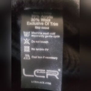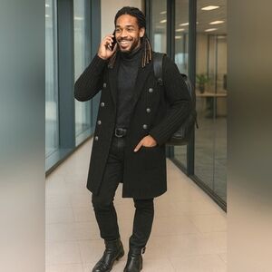 Gently Pre-Loved Open Longline Side Pockets Cardigan Car Coat in timeless black. Made in Turkey from a warm, soft blend of 70% acrylic and 30% wool, this statement piece features a shawl collar, silver-tone embossed buttons, and a sophisticated tailored fit. Perfect for layering in cooler weather.