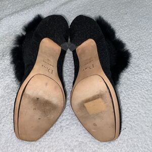 Authentic Christian Dior Canvas Fur Trim Black Ankle Boots,Cone heels with platform,Back zip closure,Minor scuffs at soles.In good Preloved condition.Approx heel height 4.75”