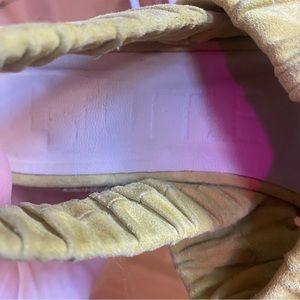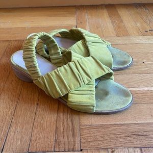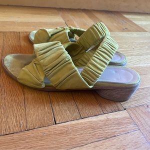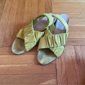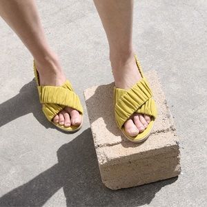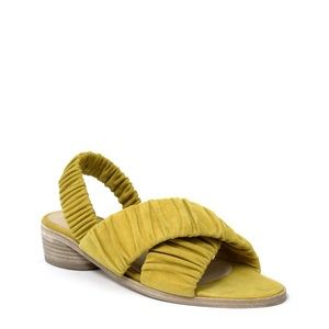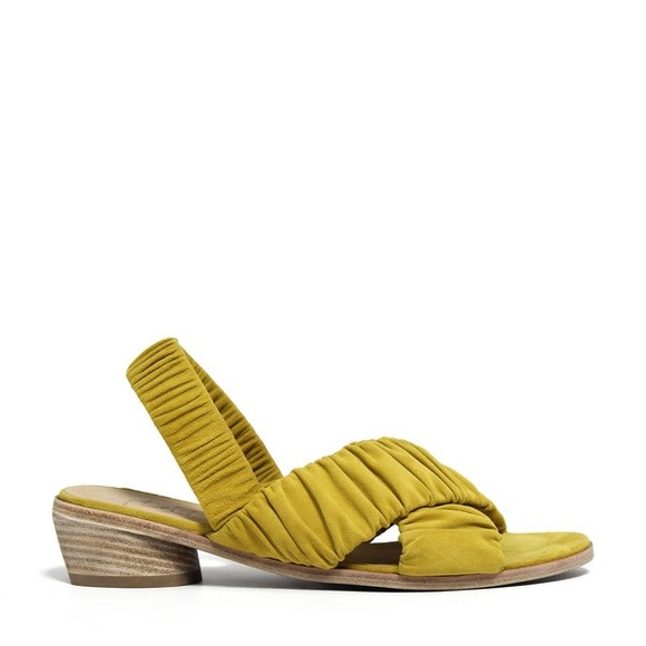 Criss cross slingback sandal with ruched straps. Made in Italy with 100% kid suede.