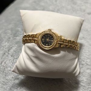 Needs battery. Crystals around face and down both sides part way. Japan Mvmt. Measures 8 inches open. Any wear listed. Gold tone stainless steel.