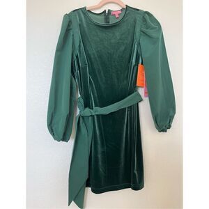 Green velvet (93% Polyester, 7% Spandex. Sleeves: 100% Polyester). Hourglass. Long sleeves. Crewneck. Back zipper closure. 34.5" from shoulder to hemline. Imported.