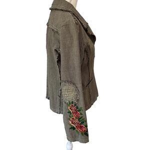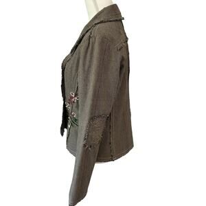 Features: Very unique blazer made in Brazil. Notched collared lapel, single button closure, raw edges, beautiful glen plaid with stunning floral embroidery and gold thread motifs.