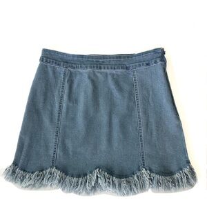 This new without tags LE LIS Denim Mini Skirt features a frayed scalloped hem with a hidden zipper on the side. It is a MUST HAVE for every closet.