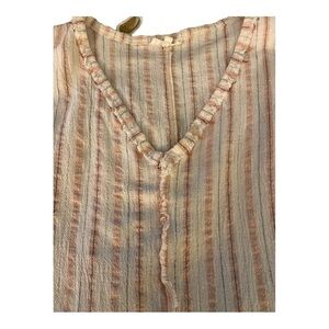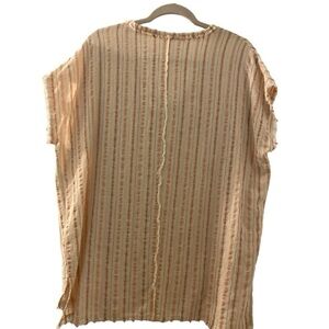Cute top for Warner weather! 100% cotton gauzy type fabric. Short cap sleeves. Vertical stripes of dusty pink and cream. Lightweight. Raw hems in sleeves, bottom, neckline and down the front and back.