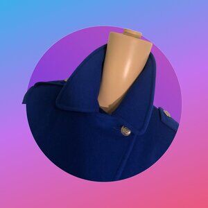 LE MONDE CASANDRA COUTURE timeless double breasted pea coat in a gorgeous royal blue color, notched lapels, structured shoulders with epaulets, and flap pockets enhancing its tailored, utilitarian style. It balances elegance and practicality, making it suitable for both urban streetwear and polished cold-weather ensembles. 100% Wool, velvety soft to the touch, blue lining and metallic crest buttons. Excellent as new condition. Pit to Pit 17 Inch Length 29 Inch Labeled SIze 2.