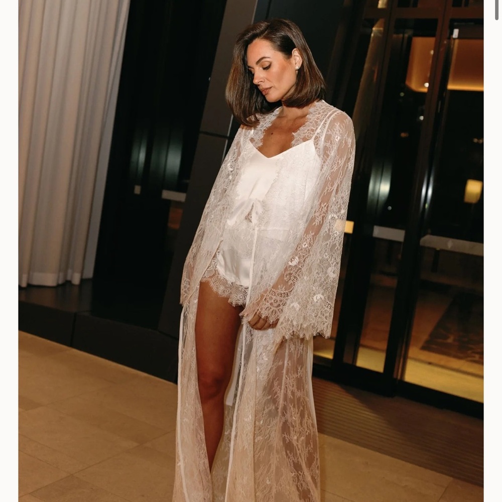 Chic white lace robe with matching slip. Perfect for wedding morning