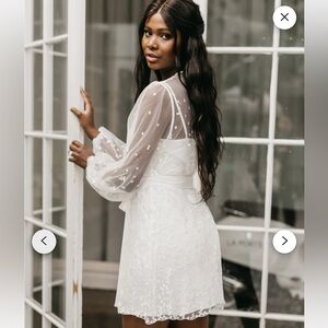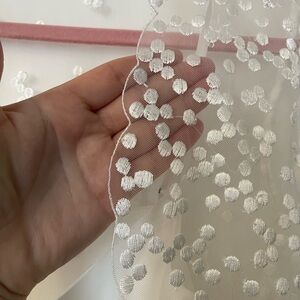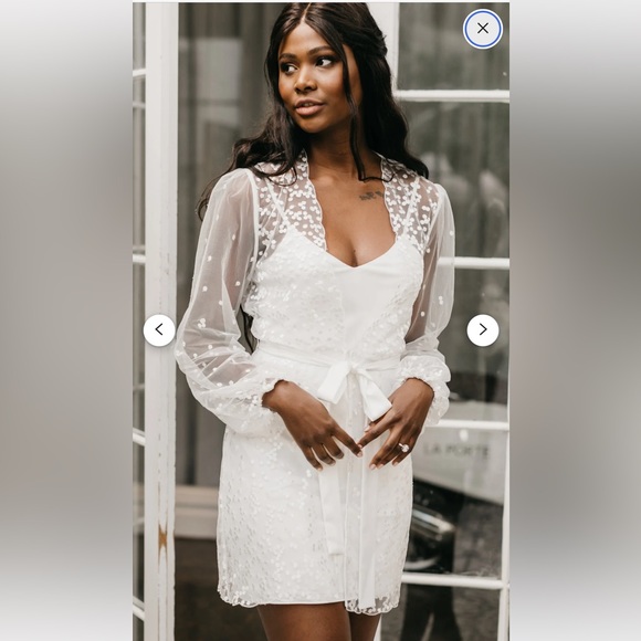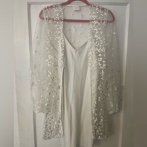 Worn once on my wedding day for getting ready and pictures. Light discoloration from spray tan on arm pit lining and on tag inside slip. Aside from that it’s in stunning condition. I was OBSESSED with this robe.
