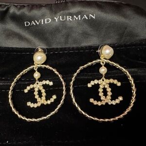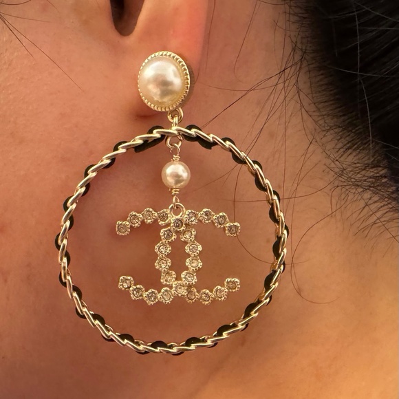 LE Rare Chanel CC Leather Quilted Pearl & Crystal Large Hoop Gold Earrings