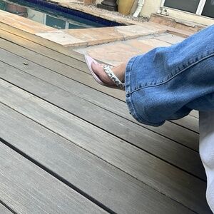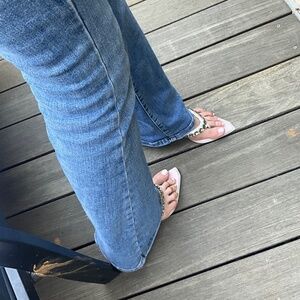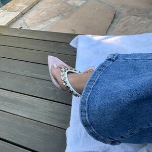 A hot summer night out slide. Made in Italy. Pale pinky-peach cotton footbed with a white leather silver studded thong. App 2 1/2” silver kitten heel. Perfect for a little lift but not too much. Very sturdy when walking. I love em. They have just the right amount of something extra without looking gaudy. Vintage almost. Maybe mid- late 00’s?? Tag still attached. Never worn. Another item from my closet of things I purged and my mom stored in hers all these years. From the time of my Los Angeles excess.