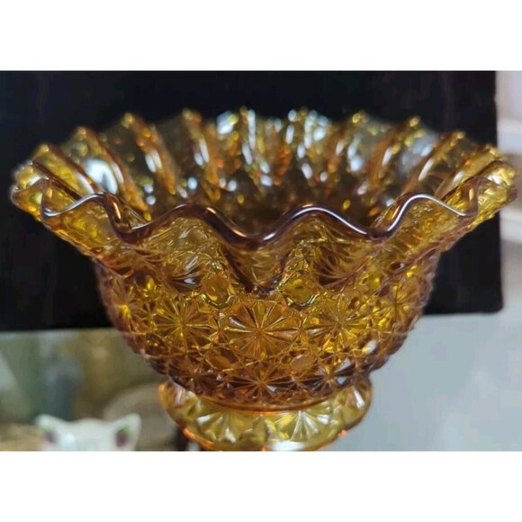 This vintage amber glass bowl/candy dish by L.E. Smith features a beautiful daisy and button pattern with a ruffled edge. The bowl/candy dish is 4 inches tall and 5.5 inches wide, with a depth of 3.75 inches and a weight of 1.5 pounds. It is an original piece from the early American prescut/EAPC product line and was manufactured in the United States between 1940-1949.
