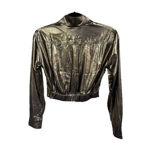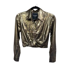 Our bestselling Tower Tuck Shirt shimmies and shines in a sexy liquid metallic gold lamé fabric. Cropped at the waist with a button cuff and a single pocket. It gives off some serious “Studio 54” vibes paired with jeans and a heel, or wear it with the matching Ritz Two-Toned Pleated skirt for a perfect holiday ‘set’.