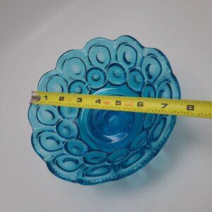 This exquisite LE Smith dish captivates with its enchanting blue glass and intricate moons and stars pattern. The scalloped edge enhances its elegance, making it a stunning centerpiece or decorative addition to any space. Crafted with attention to detail, this pedestal dish embodies both beauty and functionality, serving as an artful display piece.