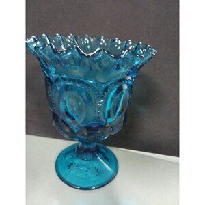 This particular piece is a vintage compote in the Moon and stars patten known for its distinctive design featuring star-like motifs and round depressions resembling moons. It is made by L.E. Smith, a well know glass manufacturer and is in the Colonial Blue color. The compote features a crimped or ruffled edge and a pedestal base, making it suitable for serving candy, fruits or as a decorative piece. Piece measures approximately 5 1/2 inches in height and 4 1/2 inches in width. Would make a great addition to your collection or a great starter piece to start your collection with. Very beautiful piece.