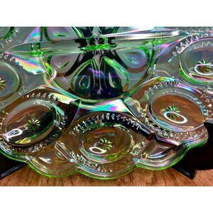 Add a touch of vintage charm to your table with this LE Smith Moon and Star deviled egg plate. Crafted in mint green carnival glass, it's perfect for entertaining or as a collectible.
