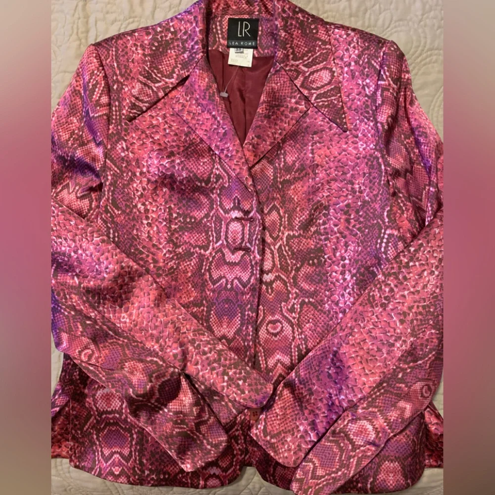 Vintage, animal print, pink burgundy skirt suit, side zipper skirt, lined jacket made in France