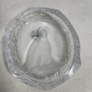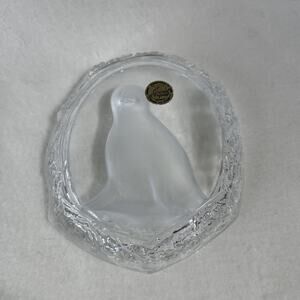 This is a lead crystal trinket dish made by CRISTAL D'ARQUES in France. It features an oval shape with a clear glass material and an etched seal image. The dish has one compartment and measures approximately 4 inches in length, 4 inches in width, and 4.75 inches in height. It weighs 10 ounces.