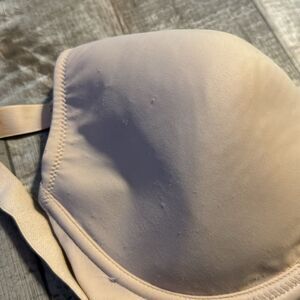 Great use condition nursing bra made by LEADING LADY- nude in color-4 hook/ eye closure- with reinforced support cups— underwire— size 36DD. There are some small snags on the exterior cups of this bra, but no holes, tears or stains. You can see these in the pics.