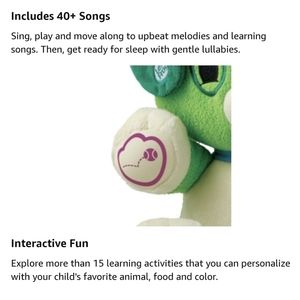 Does all sorts of stuff. Can go online and update the stores info in him to personalize with your child's info. He needs to be spot cleaned. My son loved him when he was 2-3 years old.
