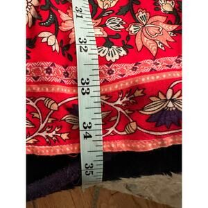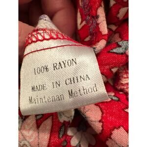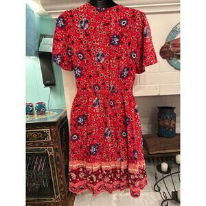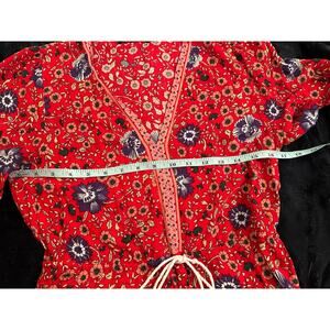 BOHO COTTAGECORE DRESS IN RED BORDER PRINT RAYON BY LEANI. SOFT, FLOWY RAYON WITH A VEE NECKLINE AND WAIST TIE WITH TASSELS TO CINCH AT THE WAIST. MEASUREMENTS IN PHOTOS, SIZE SMALL. EXCELLENT CONDITION