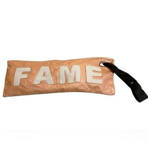 Stylish leather clutch with wrist strap. One side reads “New York”. The other side reads “Fame”.