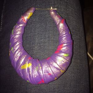 Custom Hand made Big leather earrings 80's inspired As seen on TV hit show LAHair : Purple with splashes of a Pink green orange &gold