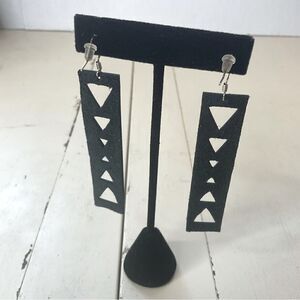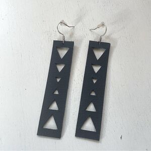 Leather Earrings Handmade Rectangle Black Triangle Cutouts. I created these earrings from a lightweight black leather. The earrings are a long rectangle with triangle cutouts of various sizes. The earwires are a silverplate. New without tags.