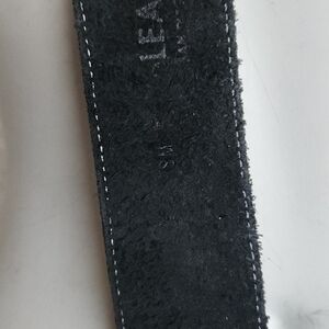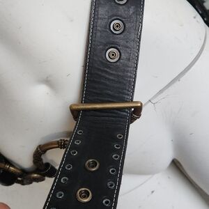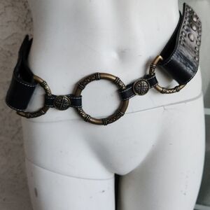 Absolutely gorgeous Italian leather belt adorned with solid brass accents and topstitched all the way around. Each end has 3 snaps flanked by brass studs. The center circle ring is flanked by 2 medallions and 2 half circles.