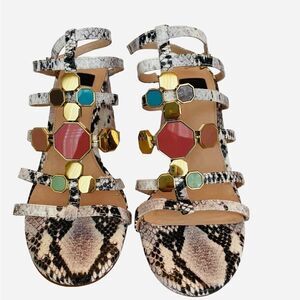 Leather heeled gladiator sandal, color plate embellishment, block heel, adjustable ankle strap