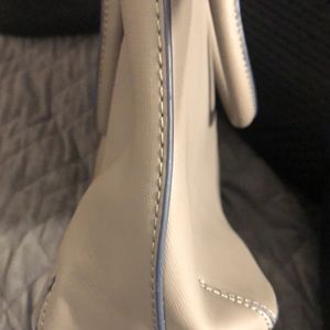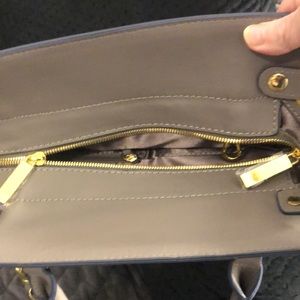 Leather Tote bag/ purse Pewter grey with gold tone hardware NWOT NEVER WORN Has a removable working timepiece that clips on with brand logo charm Has a double zipper closure on top Four feet on bottom Inside has 2 different clips for keys or other items Multiple pockets on the inside including pens or stylus Satin feel lining 100%Leather Shell 100% Polyester lining in grey some mesh pockets inside as well 2 Handles Still has protective plastic on some hardware