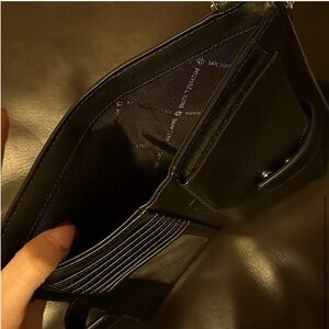 - interior details: six card slots, ID window, phone pocket, three slip pockets, two zip compartments