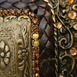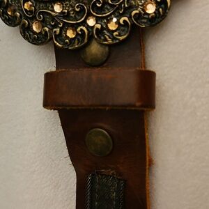 Elevate your style with this brown leather belt featuring an ornate gold buckle. Perfect for adding a touch of elegance to any outfit.