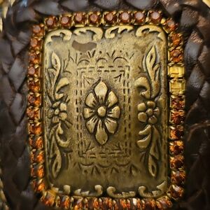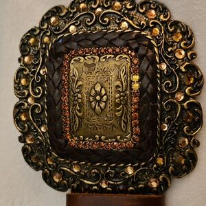 Belt Buckle is missing two rhinestones, see photo. Buckle measures 3.75" x 4.25". Belt is 1.5" wide x 41" long. Fits waist size 33" to 37".