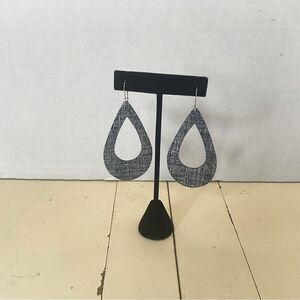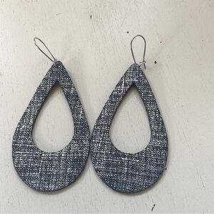 Leather earrings Handmade Teardrop Navy Blue and Silver. I created this pair of earrings by cutting out teardrop shapes and then cutting out an interiour teardrop. The leather is called Blue Denim and is a navy blue and silver. They are attached to kidney style earwires.