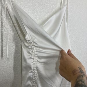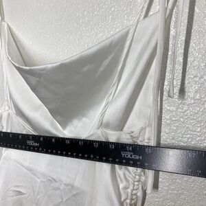 LEAU Dress Womens Small White Satin Cowl Neck Ruched Drawstring Slip Tie Straps